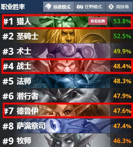 战士:血誓雇佣兵3/3/3调整为3/2/2,沸血蛮兵7/6/8调整为7/5/8,这两个改的影响不大,强的是效果。雇佣兵主要用在配合叠甲和斩杀COMBO的,很少会用了站场。因为现在主流卡组6血随从占比不多,就是龙蹄比较难处理。